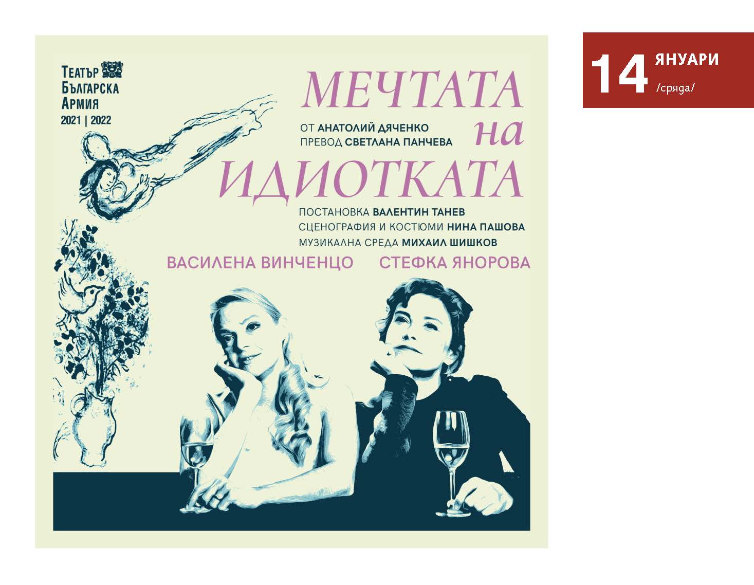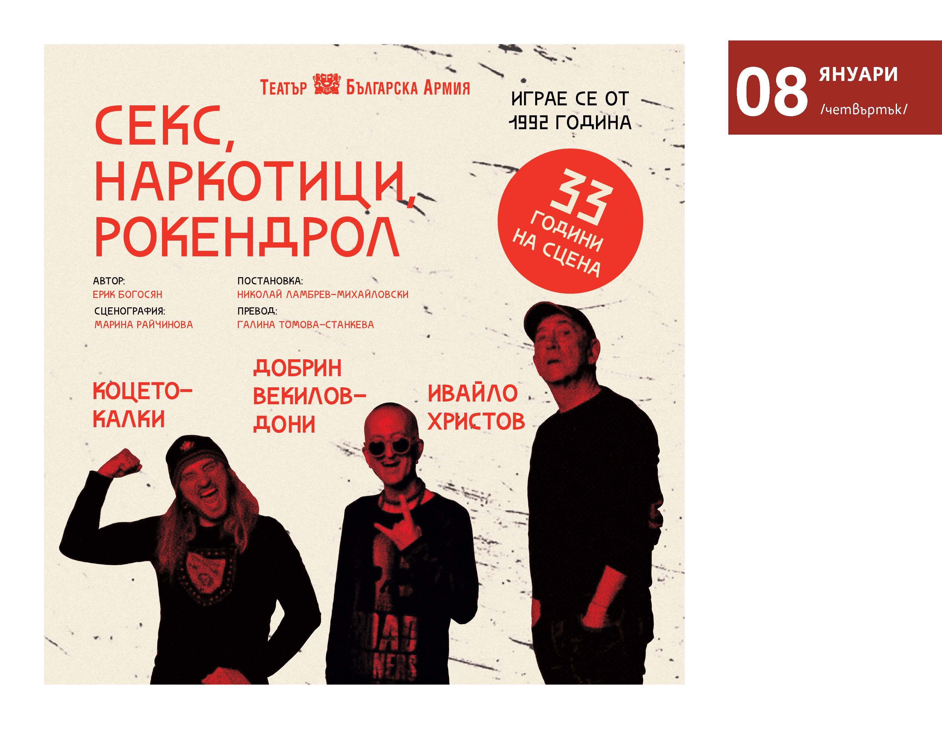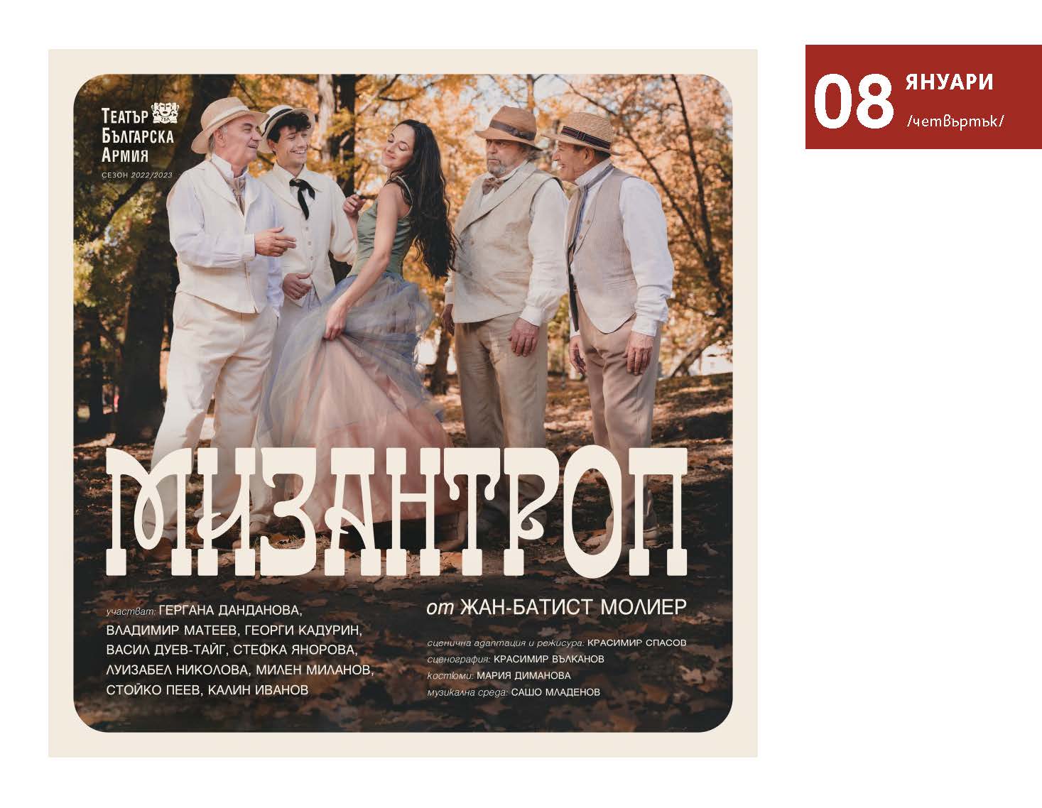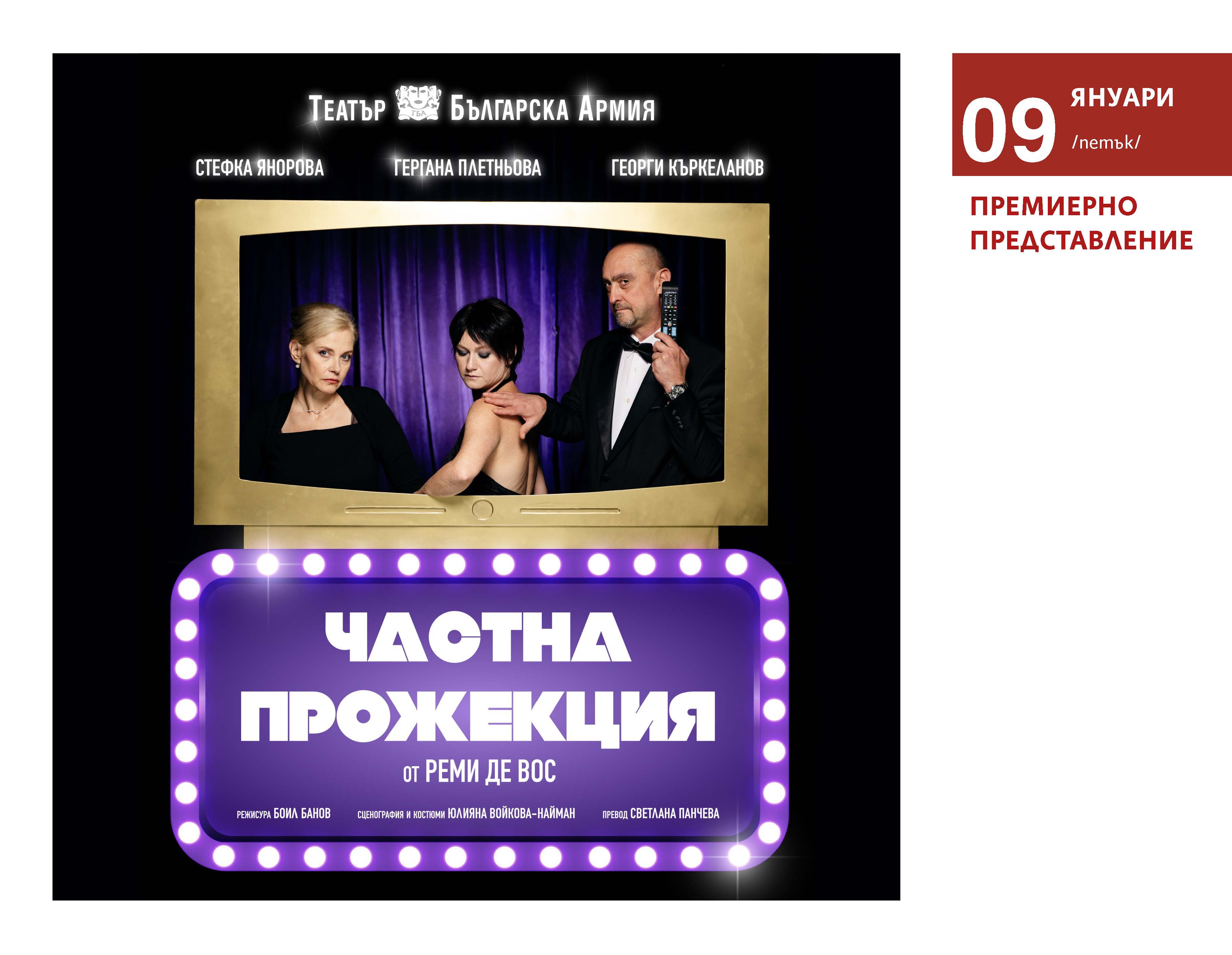 Уважаеми ЗРИТЕЛИ, всички представления на Голяма сцена на Театър "БЪЛГАРСКА АРМИЯ" са с начален час 19.00ч. Представленията на камерна сцена "Миракъл" и сцена-клуб "МаксиМ" са от 19.30ч. Закъснелите зрители НЕ СЕ ДОПУСКАТ. При отмяна на представление, ще бъдете своевременно информирани на нашата web страница. Театър "БЪЛГАРСКА АРМИЯ" си запазва правото да прави промяна в програмата.