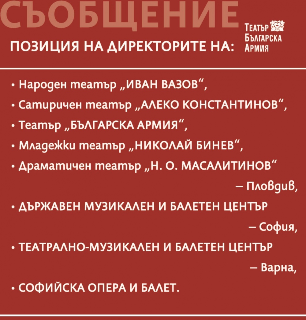 Ние, директорите на държавните културни институти в областта на сценичните изкуства, заявяваме своята професионална и отговорна позиция във връзка с натрупаните проблеми, свързани с развитието и дейността на сектор „Сценични изкуства“.